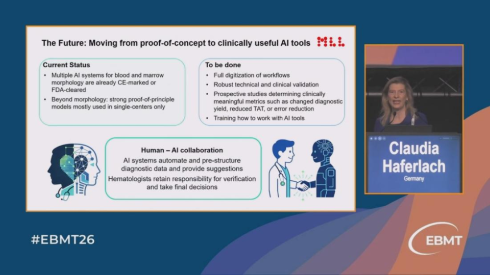 在血液学、造血干细胞移植与细胞治疗领域,人工智能(AI)已从概念探索步入深度应用的关键阶段。2026年EBMT年会设立全体会议专题探讨AI如何塑造本学科的临床研究与实践,标志着AI应用已从分散的探索走向体系化、前沿化的学科建设。本次P01专场中,汇聚了来自诊断、数据科学、细胞治疗及工程学领域的国际顶尖专家,他们通过一系列前沿研究与转化实践,系统展示了AI在诊断精准化、临床试验设计革新、细胞治疗监测预测以及多模态数据整合等方面的突破性进展,不仅呈现了当前的技术图景,更深入探讨了AI工具融入临床常规所面临的验证、监管与培训等核心挑战,为学科迈向AI驱动的新时代指明了方向。《血液时讯》特梳理专场精粹,以飨读者。