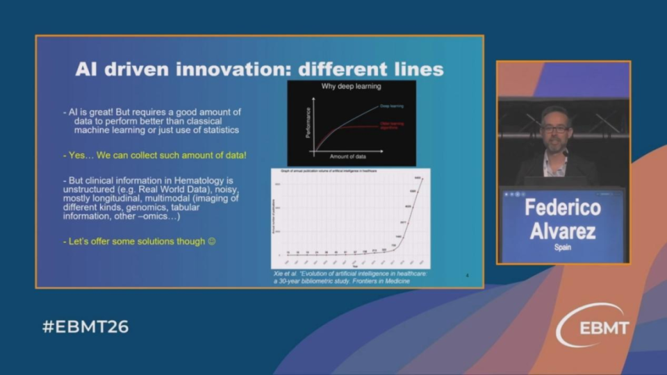 来自马德里的Federico Alvarez博士以工程师的视角,描绘了AI在血液学领域更广阔的未来图景。他指出,AI的成功依赖于大量高质量数据,但医疗数据存在非结构化、纵向、多模态等特点。当前,生成式AI的兴起为解决这些挑战提供了新思路,如用于数据增强、试验设计自动化及监管数据转换等。