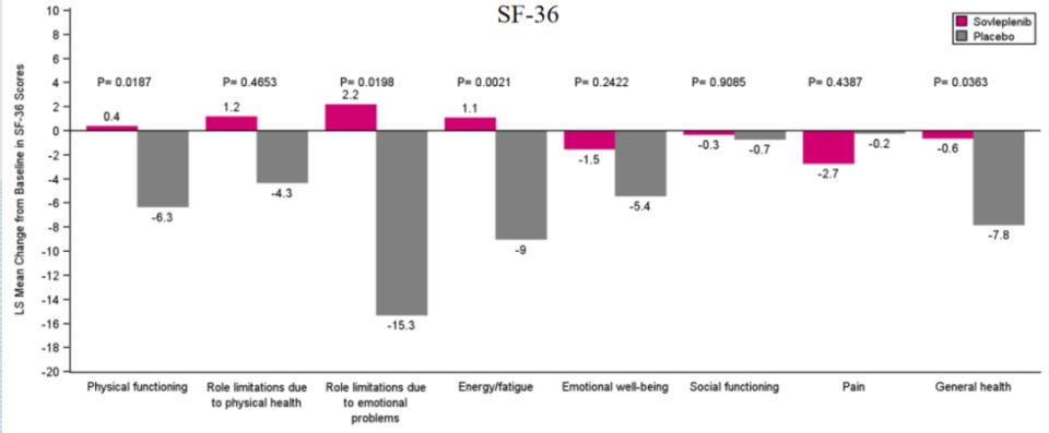 此外,索乐匹尼布在降低出血风险方面呈现出的研究结果良好。与安慰剂组相比,治疗12周和24周时,WHO出血评分的改善具有统计学意义(P=0.0002)。最后,研究提示了索乐匹尼布在改善患者的生活质量的潜在作用,包括生理功能、疲劳状态及总体健康情况等方面。
