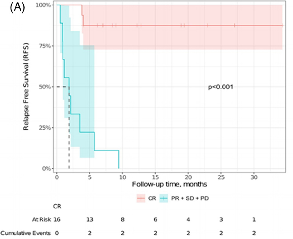 中位随访20.8个月(CAR-T输注后19.4个月),结果显示:①中位无进展生存(mPFS)达到8.4个月,6个月及12个月PFS分别为63%和43%;若按照CAR-T输注作为起始时间节点,12个月PFS为46%(见图1)。②11例患者在CAR-T治疗后复发,其中7例接受了至少一次治疗,其中2例接受全脑照射治疗(WBRT),经过4.6个月后,除1例外,其余全部死于淋巴瘤进展。在16例达到完全缓解(CR)的患者中,仅有2例随后复发。③对CAR-T治疗后达到CR和未达到CR的患者进行比较发现,12个月无复发生存(RFS)率分别为87% vs 0%(P<0.001),详见图2。