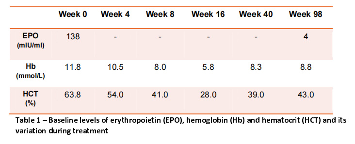 入院查全血细胞计数 (CBC) :红细胞计数 (RBC) 7.83 x 106 /L,血红蛋白 (Hb) 11.8 mmol/L,血细胞比容 (HCT) 63.8%, EPO 138 mIU/mL。完善VHL相关筛查,包括腹部、中枢神经系统和脊柱MRI,听力检查和眼科评估,以及甲氧基肾上腺素水平,均未发现异常。