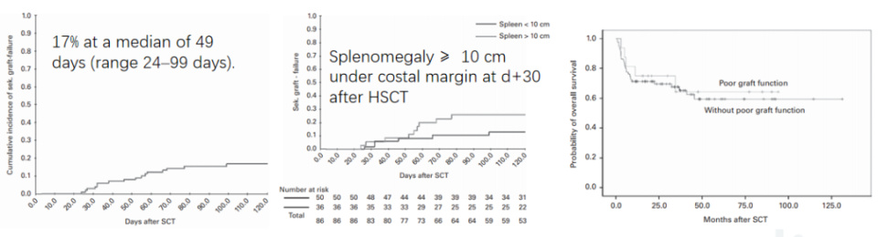 17%的患者移植后可能发生PGF,移植后1月时脾脏仍在肋缘下10cm以上是发生移植物功能不良的高危因素之一,其他危险因素还包括输注CD34细胞低、供者特异性抗HLA抗体(DSA)、CMV感染、GVHD、铁超载、骨髓微环境等,但PGF与生存无关。