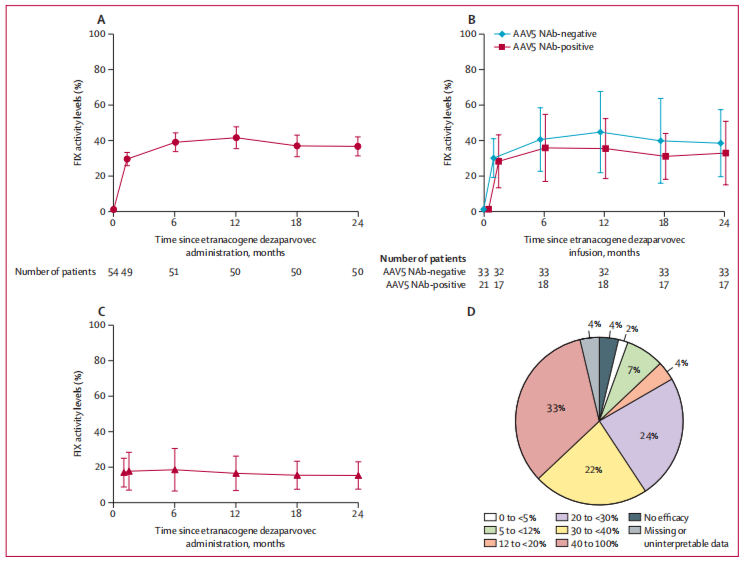 基因疗法可以产生持续的预防性因子IX水平,使用AAV载体被证明是可行的。etranacogene dezaparvovec是首个获批用于治疗血友病B的基因疗法,在3期试验中显示,与持续预防性因子IX治疗相比,基因疗法在治疗后18个月的出血保护方面更为优越。我们报告了这项试验的24个月随访疗效和安全性数据,以评估etranacogene dezaparvovec在血友病B患者中的长期效应。