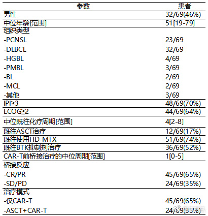 这项单中心回顾性研究分析了2019年3月至2023年8月期间在北京高博博仁医院接受CAR-T治疗的R/R CNSL患者,基线特征见表1。68%(47/69)为脑实质受累,17%(12/69)为中枢神经系统(CNS)受累,14%(10/69)为两者兼有。65.2%(45/69)的患者经桥接治疗获得客观缓解,其中33例为完全缓解(CR),12例为部分缓解(PR)。根据桥接治疗的反应,患者被分为两组:桥接有效组(BE),包括CR/PR患者;桥接无效组(BI),包括疾病稳定(SD)/疾病进展(PD)患者。在BE组中,53.3%(24/45)的患者接受了ASCT联合CAR-T疗法。