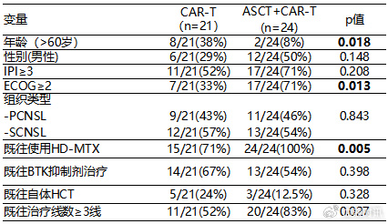 在45例BE组患者中,ASCT联合CAR-T治疗队列ECOG PS评分≥2分的患者较多,既往治疗线较多,且均为HD-MTX耐药(表2)。与仅CAR-T队列相比,ASCT联合CAR-T队列患者的中位PFS明显延长(未达到 vs. 14.76个月,P=0.0008)。该队列中位OS尚未达到,仅CAR-T队列的中位OS为27.48个月。然而,两个队列之间的差异无统计学意义(图2)。两个队列的CRS和ICANS亦均无统计学差异。