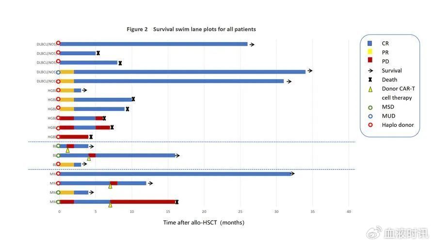 2年无进展生存(PFS)率和总生存(OS)率分别为30.2%(95%CI:9.5-54.3)OS和40.4%(95%CI:14.7-65.2)。相比之下,移植前PR/CR队列的PFS和OS明显长于PD队列,两个队列的中位PFS为10.2个月 vs. 1.9个月(P=0.0006),中位OS为14.8个月 vs. 6.5个月(P=0.0178)。4例(4/18,22.2%)移植前疾病状态为PD的患者死于疾病进展,4例患者(4/18,22.2%)死于感染。所有患者的生存泳道图见图1。