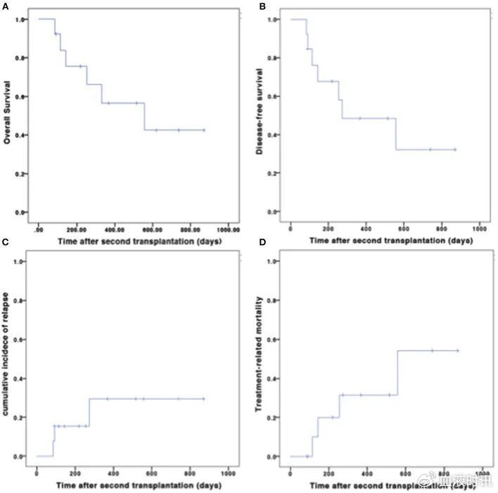 孙教授团队于2021年发表了纳入13例患者的小样本研究结果(Front Med (Lausanne), 2021, 8: 604085.)。结果显示,二次移植后,存活患者的中位随访时间为515天(92-869天)。在最后一次随访中,有7名患者仍存活。6例死亡患者中,4例为TRM,2例为疾病复发。二次移植后1年的OS和DFS分别为56.6%和48.4%。结果十分令人鼓舞,显著地优于既往文献报道。