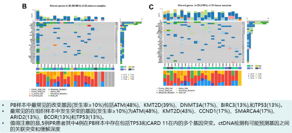 奥布替尼联合利妥昔单抗已被证明可以协同增效诱导的NK细胞介导的ADCC,促进肿瘤凋亡。奥布替尼联合来那度胺和利妥昔单抗(OLR)的治疗方案,作为一线治疗未经治疗的MCL患者,已在POLARIS研究中显示出显著的疗效和良好的耐受性。截至2024年2月15日的数据截止日期,29例患者中,96.6%完成了6个周期的诱导治疗,其中67.9%达到了完全缓解(CR),总缓解率(ORR)为85.8%。此外,通过二代测序(NGS)检测外周血循环肿瘤DNA(ctDNA),以评估肿瘤的深度缓解情况,能够有助于预测预后。ctDNA的水平越低,表明肿瘤残留越少,提示患者可能有更好的预后和治愈的潜在可能性。在25例MRD分析中,外周血MRD(PB-MRD)和骨髓MRD (BM-MRD)均为阴性。在安全性方面,28例患者中96.6%发生了不良事件,主要为血液学毒性,但无死亡报告。这些数据表明,奥布替尼联合方案不仅在提高缓解率方面展现出潜力,同时保持了治疗的安全性。