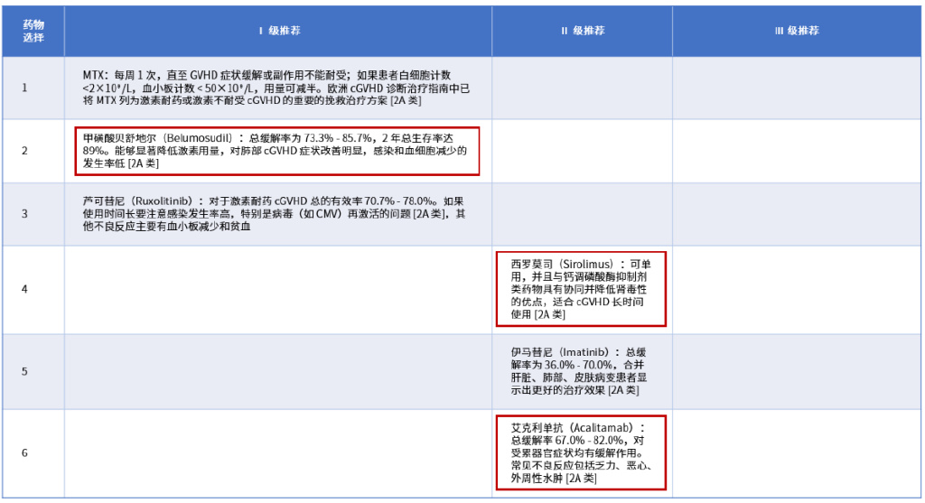 在cGVHD二线治疗的Ⅰ级推荐中增加“甲磺酸贝舒地尔(2A类)”,Ⅱ级推荐中增加“西罗莫司(2A类)”和“艾克利单抗(2A类)”,Ⅲ级推荐中增加“本外光分高置换术(ECP)(2C类)”,见下表。
