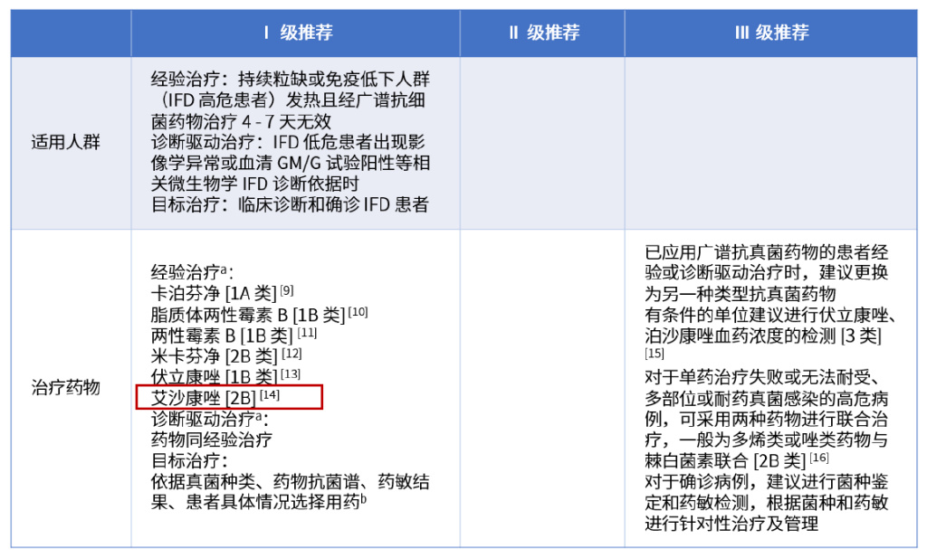 在治疗药物的I级推荐中增加“艾沙康唑”,见下表。