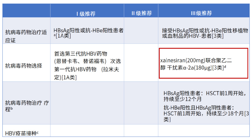 在HBV再激活/感染防治中,增加“干扰素治疗”的Ⅲ级推荐,见下表。