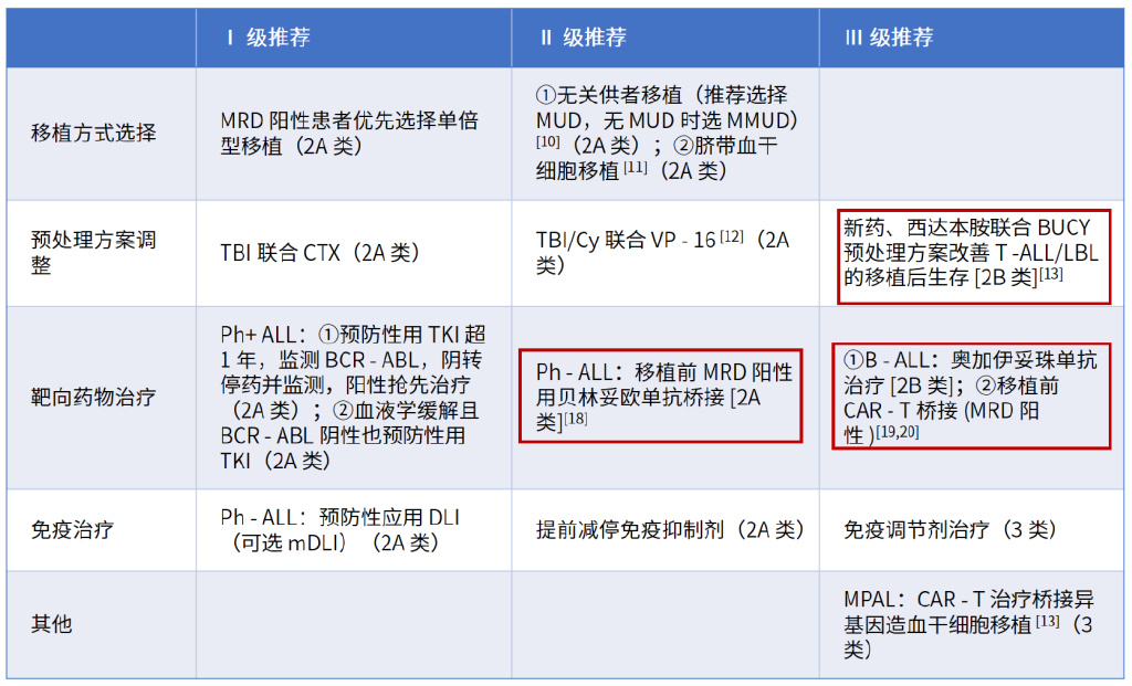 针对ALL移植后复发的预防,在预处理方案调整的Ⅲ级推荐中,增加“西达本胺联合BUCY预处理方案改善T-ALL/LBL的移植后生存(2B类)”;在靶向药物治疗中,将“Ph-ALL:移植前MRD阳性用贝林妥欧单抗桥接”由Ⅲ级(2B类)推荐调整为Ⅱ级(2A类)推荐,并在Ⅲ级推荐中增加“②移植前CAR-T桥接(MRD阳性)”,见下表。