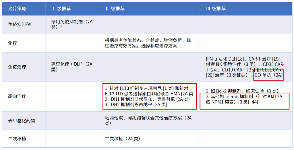 针对AML移植后复发的抢先治疗,在靶向药物的Ⅲ级推荐中新增“阿伐替尼(3类)”和“去甲基化药物(3类)”;在细胞免疫治疗的I级推荐中新增“改良DLI(2A类)”,见下表。