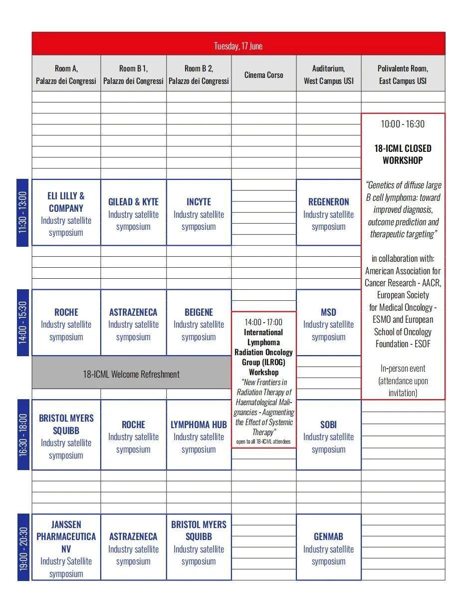此外,还包括科学专场(Scientific Program)、行业专场(Industry Program)、独立卫星研讨会(Independent Satellite Symposia)、研习专场(Workshop)、行业赞助研讨会(Industry Sponsored Symposium)、ESMO-ICML专题讲座(ESMO-ICML Special Lecture)、IBSA基金会专场(IBSA Foundation Special Forum)、闭门研讨会(Closed Workshop Report)、临床病例讨论专场(Clinical Cases Discussion)等专场,通过学术纵深与横向协作的有机融合,构建起覆盖淋巴瘤全链条管理的知识网络,为参会者提供兼具科学创新性与实践指导性的学术体验。