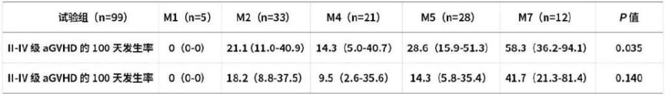 在试验组中,AML亚型对100天II-IV级aGVHD的发生率有显著影响(M1、M2、M4、M5和M7),但III-IV级aGVHD的发生率在不同亚型之间无统计学差异(见表1)。