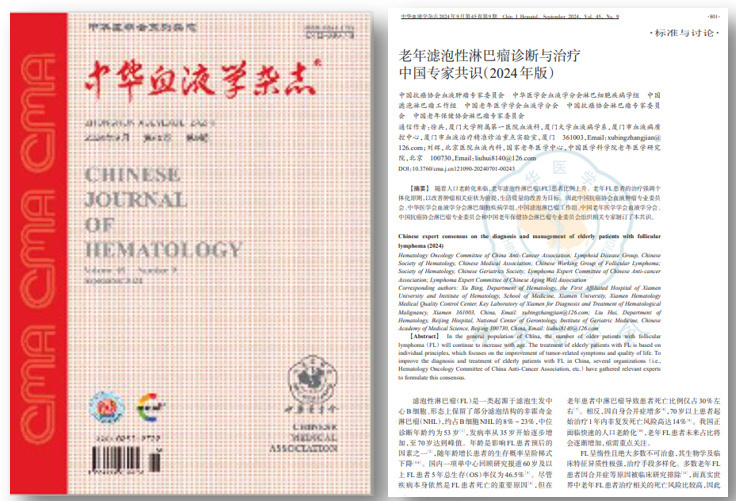 FL好发于老年患者,诊断时的中位年龄为63岁,其中55-75岁患者占比最高(54.8%)。目前针对老年FL患者的诊疗尚无标准化流程遵循,更需强调个体化治疗原则。为提高临床医师对老年FL的诊治水平,改善老年FL患者生活质量,由徐兵教授、刘辉教授牵头的《老年滤泡性淋巴瘤诊断与治疗中国专家共识(2024年版)》(以下简称2024版共识)于去年10月正式发布。