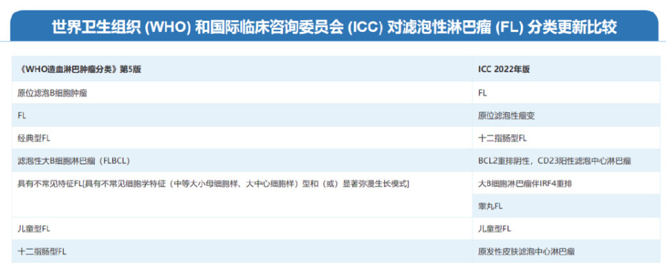 2022年世界卫生组织(WHO)和国际临床咨询委员会(ICC)分别对成熟B细胞肿瘤进行了更新,新分类均更加注重疾病发病机制对于疾病界定的影响,区别在于对无BCL2重排疾病的归类。