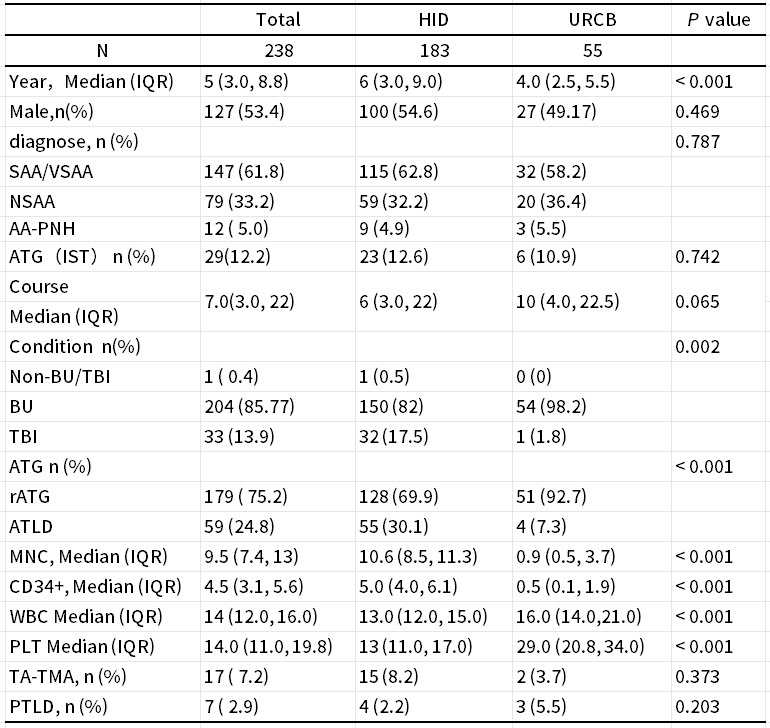 本研究共纳入238例患儿,包括重型/极重型再生障碍性贫血(SAA/VSAA)、输血依赖型非重型再生障碍性贫血(TD-NSAA)及再生障碍性贫血-阵发性睡眠性血红蛋白尿综合征(AA-PNH)三种类型。将其分为两组:HID组183例,URCB组55例。两组在基线特征(性别、诊断分组、既往ATG治疗史)均无统计学差异。HID组更多接受全身放疗(TBI)和抗人T淋巴细胞兔免疫球蛋白(ATLG)(表1)。