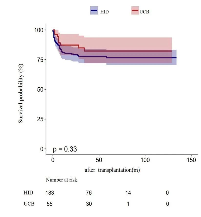 238例患者中,原发性移植物功能衰竭(PGF)8例,HID 4例(2.18%),URCB 4例(7.27%)。血小板衰竭20例(含8例PGF),HID 11例(6%),URCB 9例(16.4%)。评估了230例患者的粒细胞植入情况,中位植入时间HID 13.0天(12.0,15.0)vs. URCB 16.0 天(14.0,21.0),P<0.001;评估了218例患者的血小板植入情况,中位植入时间HID 13 天(11.0,17.0)vs. URCB 29.0 天(20.8,34.0),P< 0.001。OS中位随访42个月(20.2-65),5年OS方面:HID 76.6%(0.70-0.83)vs. URCB 83.2%(0.72-0.94),P=0.33(图1)。