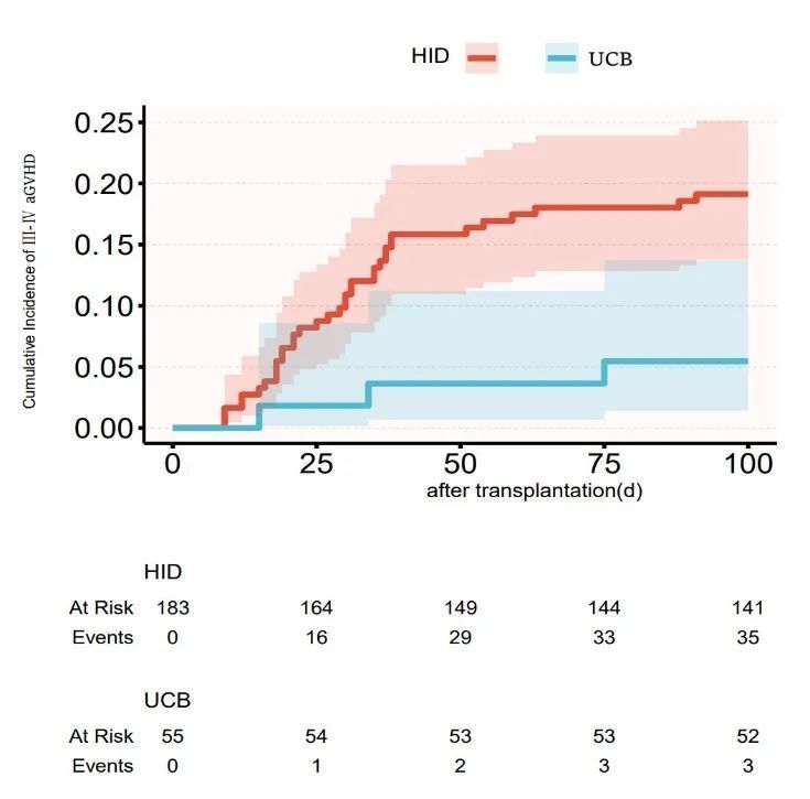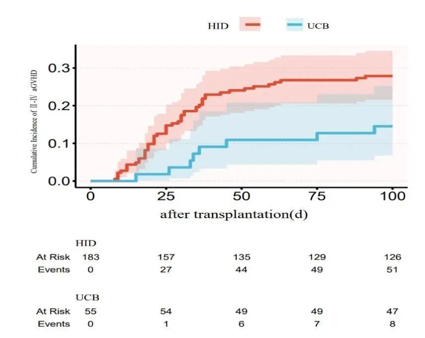 100天Ⅱ-ⅣaGVHD累积发生率方面,HID 27.87%(21.56%-34.51%)vs. URCB 14.54%(6.74%-25.20%),P=0.036(图3)。