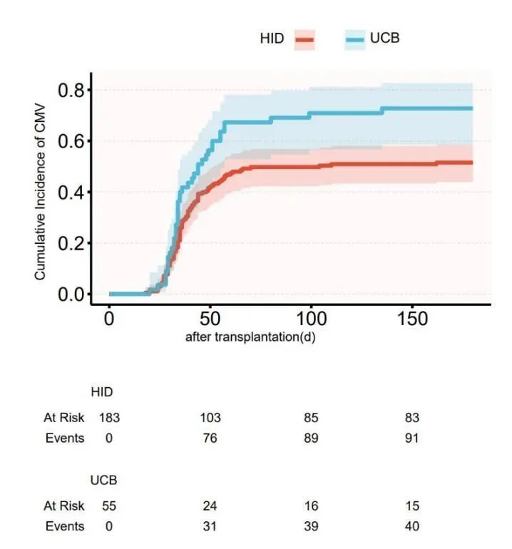 180天CMV累积发生率方面,HID 51.52%(43.88%-58.62%)vs. URCB 72.72%(58.58%-82.74%),P=0.006(图6)。