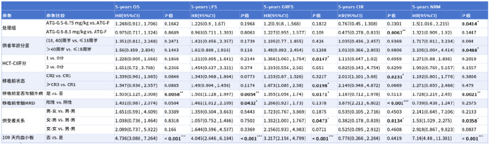 Cox逐步回归模型多因素分析生存结局:ATG-G 5-6.75 mg/kg对比ATG-F具有更高的NRM[HR 1.500,95%CI(1.016-2.215),P=0.041],ATG-G(7-8.5 mg/kg)对比ATG-F 具有更低的CIR[HR 0.475,95%CI(0.278-0.813),P=00067](见表2)。