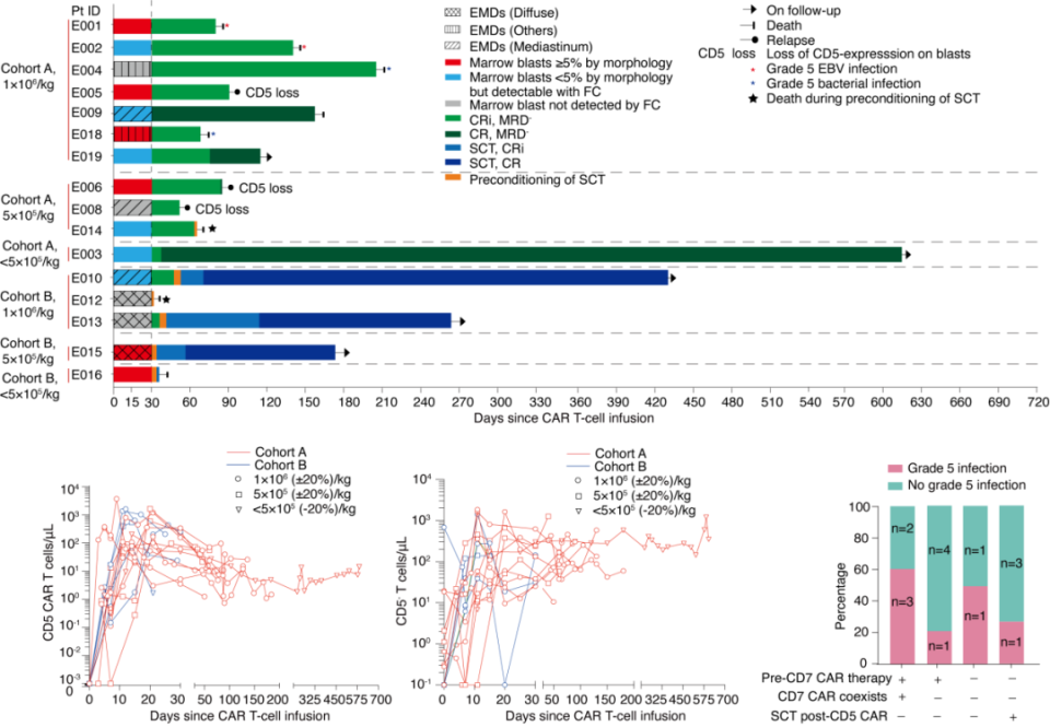 16名(100%)患者在输注后第30天的血象未恢复的完全缓解率(CRi)达到了100%。截至2023年7月31日,中位随访时间为14.3个月(IQR,6.2~19.7)。4例患者在输注后第35天(IQR,31~40)接受SCT,其中3例无病生存,1例死于真菌感染;在12例未接受移植(7人拒绝移植,3人在移植前复发,2人在SCT预处理期间死亡)的患者中,2人维持缓解状态,3人复发,5人死于感染(2例EB病毒感染和3例细菌感染),2人死于血栓性微血管病。在所有接受治疗的患者中,一半的5级感染发生在CD7 CAR-T细胞共存但没有接受SCT巩固治疗的患者中。低水平的CD7 CAR-T细胞不影响CD5 CAR-T细胞的扩增,CD5 CAR-T细胞一直占主导地位直到最后一次复诊。CD5+淋巴细胞减少,但CD5-淋巴细胞增加,部分来源于CD5基因编辑产物。