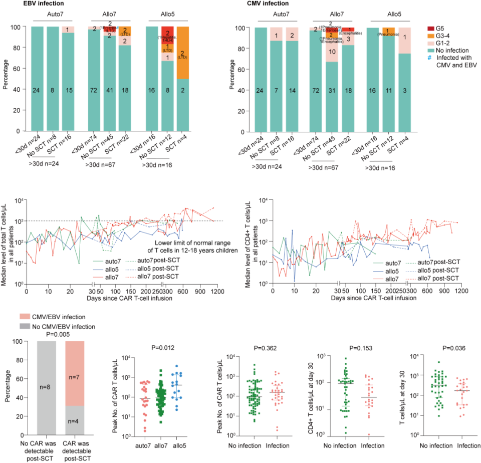 图2. CAR-T细胞输注后的EBV和CMB感染情况、T细胞和CD4+T细胞水平