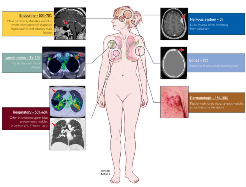LCH临床表现多样化,容易诊和误诊。首发症状多样,以尿崩、骨痛、皮疹最为常见,B症状(发热、体重减轻)亦较为常见。主要受累器官包括骨骼、肺、垂体等。骨骼受累以溶骨性破坏为主要表现,颅骨、四肢长骨及骨盆为好发部位,可表现为单发或多发骨质缺损。肺部受累的典型影像学表现为双肺弥漫性薄壁囊样变及肺大泡、气胸,成人单纯肺受累较为常见。吸烟是LCH肺病的重要危险因素。皮肤病变呈现异质性皮疹,最常见的表现为糜烂及破溃,累及生殖器或肛周黏膜时容易被误诊为尖锐湿疣等疾病。