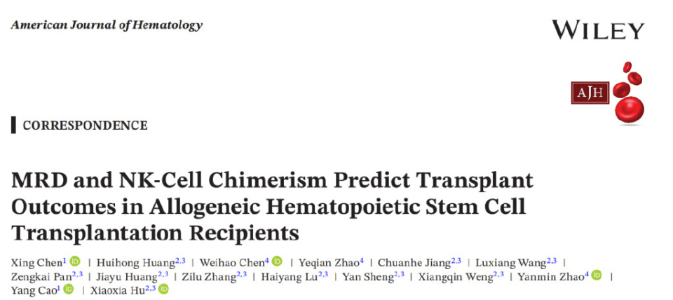 Chen X, Huang H, Chen W, et al. MRD and NK-Cell Chimerism Predict Transplant Outcomes in Allogeneic Hematopoietic Stem Cell Transplantation Recipients. Am J Hematol. 2025 Jun 19. doi: 10.1002/ajh.27750. Epub ahead of print. PMID: 40536068.