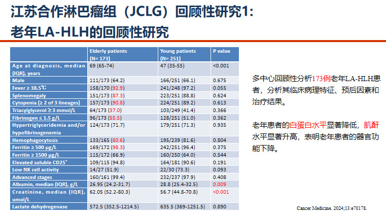 HLH是一种由各种诱因激活导致的细胞毒性T细胞和NK细胞过度活化,并刺激巨噬细胞活化,分泌大量炎性细胞因子导致多器官、多系统受累的临床综合征。其中,淋巴瘤相关噬血细胞综合征(LA-HLH)是一类由淋巴瘤诱发的、以免疫异常激活为特征的严重并发症,其在老年群体中具有独特临床表现与预后模式。江苏合作淋巴瘤组对老年LA-HLH患者展开了多项深入研究,试图揭示其临床特征、预后影响因素以及治疗结局。