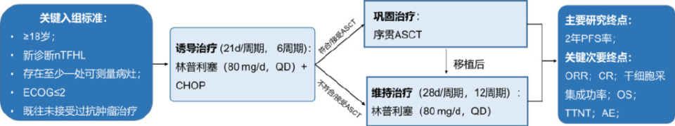 本研究为多中心、单臂、前瞻性研究,旨在评估林普利塞联合CHOP方案治疗拟接受ASCT的初治nTFHL受试者的有效性和安全性。所有受试者接受林普利塞(80 mg,QD)联合CHOP方案的诱导治疗(21 d/周期,6周期)。随后依据Lugano 2014标准进行疗效评估,达完全缓解(CR)/部分缓解(PR)受试者若符合移植条件则行ASCT,完成移植后待血细胞计数恢复正常(约6-8周)接受林普利塞单药维持治疗(80 mg,QD)(28 d/周期,12周期);不符合移植条件则直接接受林普利塞单药维持治疗。主要研究终点为2年PFS率,次要研究终点包括总缓解率(ORR)及CR率(诱导完成时及移植后)、干细胞采集成功率、OS率,至下次治疗开始时间(TTNLT)以及安全性。