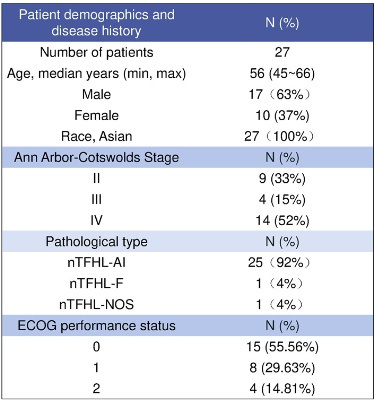 截至2025.01.10,共入组27例患者,中位年龄为56(45-66)岁,男女比例为2:1。最常见亚型为nTFHL-血管免疫母细胞型(nTFHL-AI,92%),其次为nTFHL-滤泡型(nTFHL-F,4%)及nTFHL-非特指型(nTFHL-NOS,4%),18例(67%)患者临床诊断为III-IV期。所有患者均完成了至少2个周期的诱导治疗。