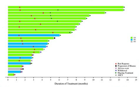 在25例可评估疗效的患者中,最佳ORR达96%(24/25),最佳CR率为72%(18/25),最佳PR率为24%(6/25)。此外,达到缓解的中位时间为50.5天,达CR的中位时间为66天。10例患者完成6周期诱导化疗,其中1例患者达到PR,9例患者达到CR。6例患者诱导治疗后成功接受了ASCT。
