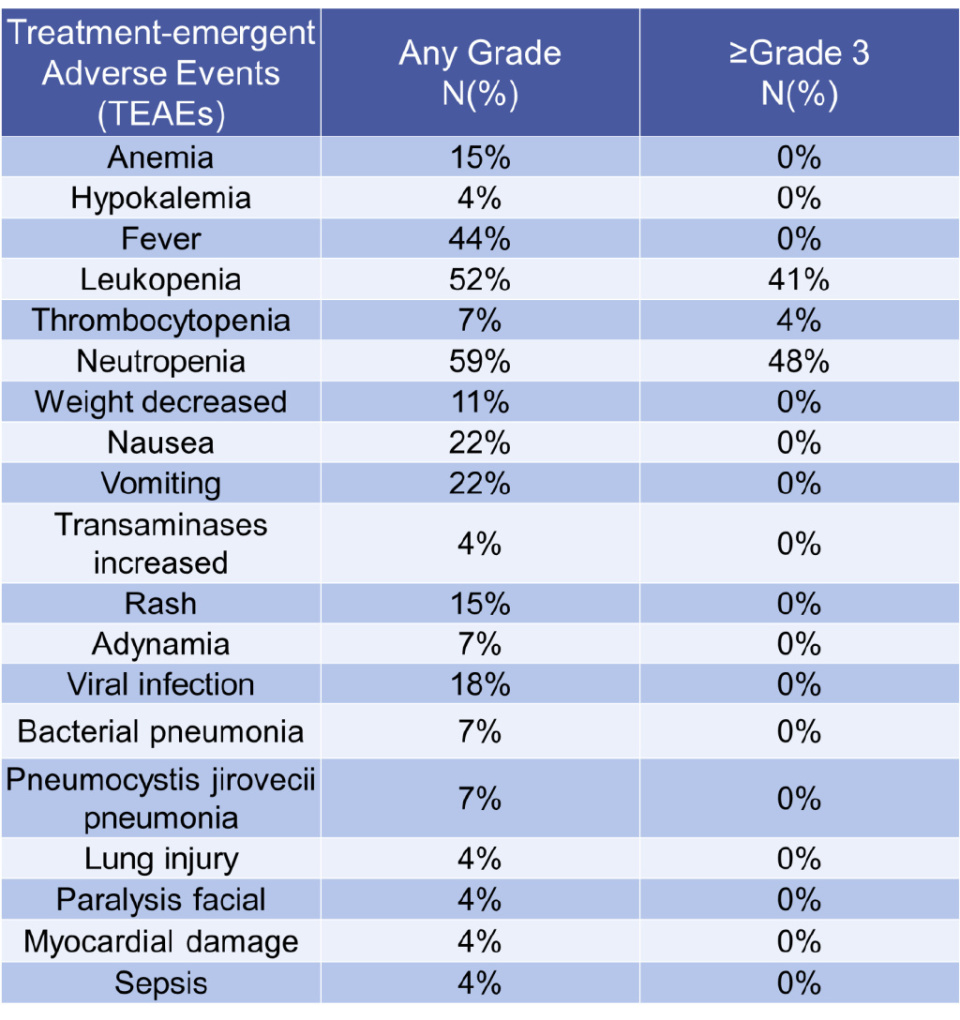 治疗期间出现的不良事件(TEAE)发生率为93%(25/27),以中性粒细胞减少(59%)及白细胞减少(52%)最常见。≥3级TEAEs包括中性粒细胞减少(48%)、白细胞减少(41%)及血小板减少(4%)。3例患者因TEAE减少药物剂量。3例(11%)患者因感染中断治疗。2例患者观察到耶氏肺孢子菌肺炎(PJP),其中1例患者因PJP停止治疗。