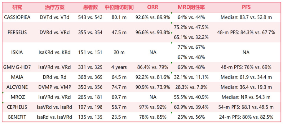 诱导治疗的格局随着抗CD38单抗达雷妥尤单抗(D)被纳入硼替佐米-沙利度胺-地塞米松(VTd)三联疗法,并且最近被纳入硼替佐米-来那度胺-地塞米松(VRd)方案而发生了变化。在III期CASSIOPEIA研究中,与VTd组相比,D-VTd组在MRD阴性率、无进展生存期(PFS)和总生存期(OS)方面表现更优;同样,在PERSEUS研究中,与VRd组相比,D-VRd组在MRD阴性率和PFS方面也表现出优势。