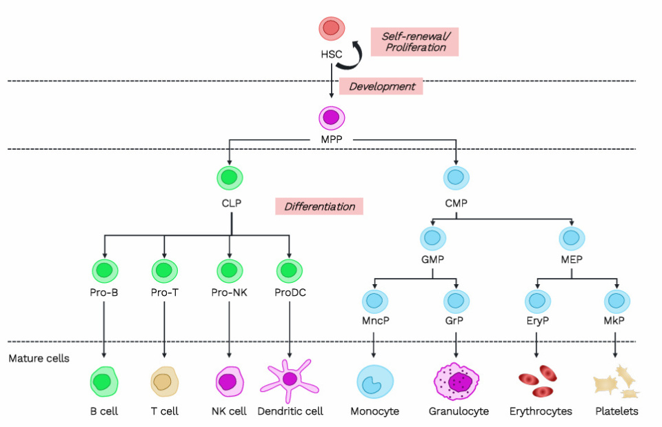 造血干细胞(HSCs)位于造血细胞层级的顶端,在血液细胞的持续更新中起着至关重要的作用。造血干细胞的特点是具备自我更新和分化为多种细胞类型的潜能,能够在骨髓(BM)中产生所有成熟的血细胞谱系。其通过一系列中间前体细胞发挥作用,为每个谱系提供独立的更新途径。而骨髓微环境(或微环境)则通过提供造血干细胞自我更新和持续造血所需的必需成分来调控其维持和分化。