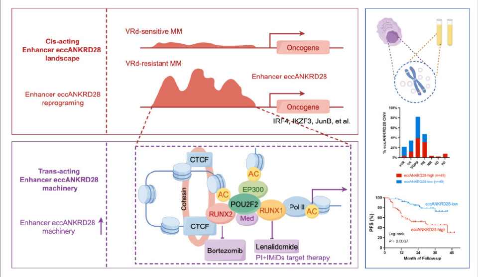 我们描绘了eccDNA的全基因组图谱,并鉴定出具有预后和治疗效果预测价值的 eccANKRD28。我们进一步评估了98例NDMM患者和10例供体的eccANKRD28拷贝数,发现诊断时eccANKRD28拷贝数高的患者无进展生存期(PFS)显著较差(中位PFS 29个月 vs. 尚未达到,HR 3.14,95%CI:1.64-5.99,P=0.0007)。eccANKRD28拷贝数与参与/未参与的游离轻链比率[FLCR(i/ u)](P=1.0e-9,r=0.62,n=80)、β2-MG(P=0.04,r=0.24,n=78)以及骨髓浆细胞百分比(BMPC%)(P= 2.6e-14,r= 0.79,n=61)呈正相关。已建立的VRd耐药RPMI-8226、U266 和OPM-2细胞系显示出更高丰度的eccANKRD28以及增强的转录活性,CRISPR/Cas9介导的eccANKRD28升高在体内外均降低了硼替佐米和来那度胺治疗的敏感性。综合多组学分析(H3K27ac ChIP-seq、scRNA-seq、scATAC-seq、CUT&Tag等)识别出 eccANKRD28作为一种由关键转录因子POU class 2 homeobox 2(POU2F2)驱动药物耐药性的活性增强子。POU2F2与序列特异性的eccANKRD28以及RUNX1和RUNX2模序相互作用形成蛋白质复合物,激活包括IRF4、JUNB、IKZF3、RUNX3和BCL2在内的癌基因的启动子。