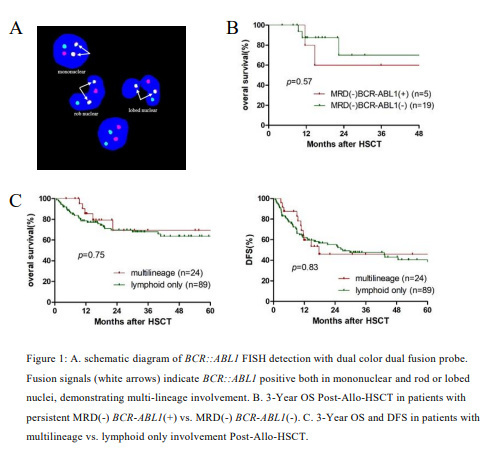 所有患者病程中监测MICM,发现5例患者细胞形态学完全缓解,流式微小残留病(MRD)为0时,融合基因定量监测仍持续出现较高BCR-ABL1,阳性值范围5.55%->10%(国际标准值),3例患者进而采用CD19 CAR-T治疗,30天后监测融合基因定量仍未转阴,基因定量值分别为3.35%、11.5%、13.4%。对2例患者进行不同系别细胞流式分选,分选后细胞的FISH和PCR定量检测,同时证实BCR-ABL1融合基因累及髓系,患者并未出现髓系白血病的临床表现以及实验室特征。这5例患者进行了异基因造血干细胞移植,移植后动态监测融合基因定量和流式MRD,均持续阴性,3例患者获得长期生存,生存期分别为35.9、54.2、68.8个月,2例患者死于感染和移植物抗宿主病(GVHD),与其余移植患者相比,移植后3年OS无显著差异(P=0.57)。