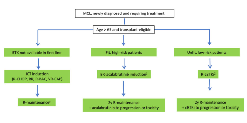 不适合移植的>65岁患者群体在体能和认知能力方面表现出高度异质性。体能状态良好的>65岁患者应接受常规免疫化疗后接利妥昔单抗维持治疗。一项大型国际III期试验证实,硼替佐米、利妥昔单抗、环磷酰胺、阿霉素和泼尼松(VR-CAP)联合方案相比R-CHOP方案显著延长了总生存期(OS),82个月时的OS翻倍(90.7个月 vs. 45.7个月)。然而,试验组血液学毒性(尤其是≥3级血小板减少症)显著增加(57% vs. 6%),因此建议修改硼替佐米用药方案(仅第1天和第4天给药)。利妥昔单抗、苯达莫司汀联合阿糖胞苷(R-BAC)方案提供了另一种有效的选择。但该方案伴随着严重的血液学毒性,因此应仅用于体能状态极佳且具有高风险特征(如母细胞样变异型、高LDH水平)的老年患者。