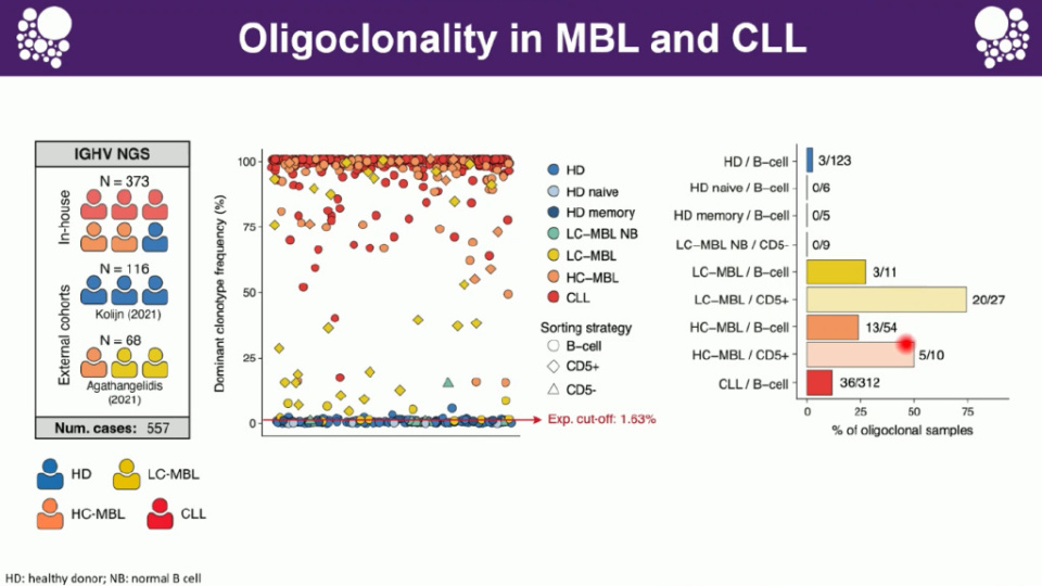 传统观点认为,慢性淋巴细胞白血病(CLL)是一种单克隆疾病,所有肿瘤细胞均源自同一个原始细胞,因此共享相同的B细胞受体(B-cell Receptor, BCR)。然而,临床上约有5%至10%的CLL病例以及更高比例的癌前病变——单克隆B细胞淋巴细胞增多症(Monoclonal B-cell Lymphocytosis, MBL)中观察到了寡克隆现象。这些线索表明,CLL的起源可能比我们想象的更为复杂,或许存在一个多克隆的起源过程。为了探究这一问题,来自西班牙著名血液病理学家Elias Campo教授实验室的一位青年学者,在本次大会上系统报告了他们团队的最新研究成果。