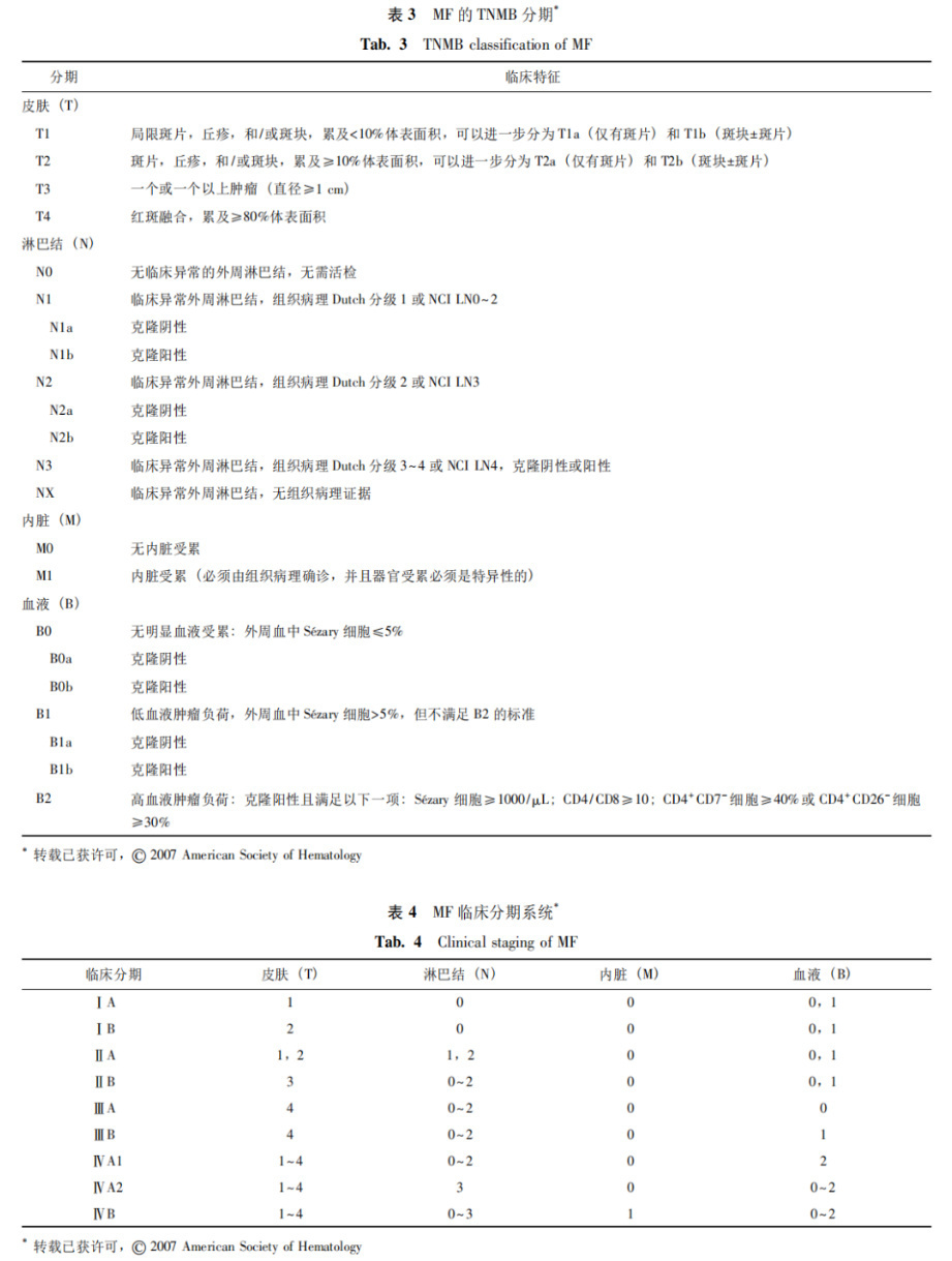 临床分期基于皮肤(T)、淋巴结(N)、内脏(M)、血液(B)的受累情况划分,具体包括IA期、IB期、IIA期、IIB期、IIIA期、IIIB期、IVA期、IVB期,各期对应不同的T、N、M、B 状态,为治疗方案选择和预后评估提供基础。