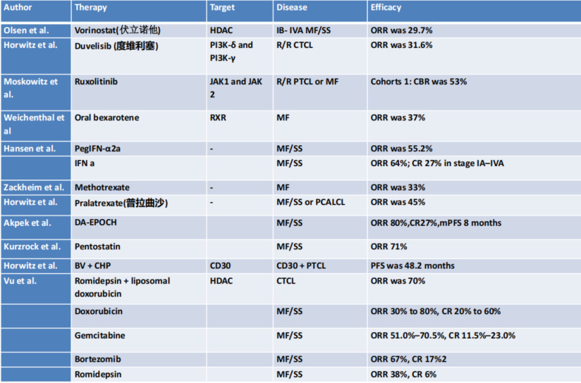 不同系统治疗药物的疗效存在差异,主要包括普拉曲沙/吉西他滨、口服贝沙罗汀/小剂量甲氨蝶呤(MTX)、干扰素/组蛋白去乙酰化酶(HDAC)抑制剂、维布妥昔单抗、莫格利珠单抗(CCR4单抗),以及强化化疗或联合化疗方案等。其中,免疫治疗通过靶向特定分子发挥作用,常用方案包括阿伦单抗、维布妥昔单抗、莫格利珠单抗、拉可妥单抗、帕博利珠单抗、纳武利尤单抗等。