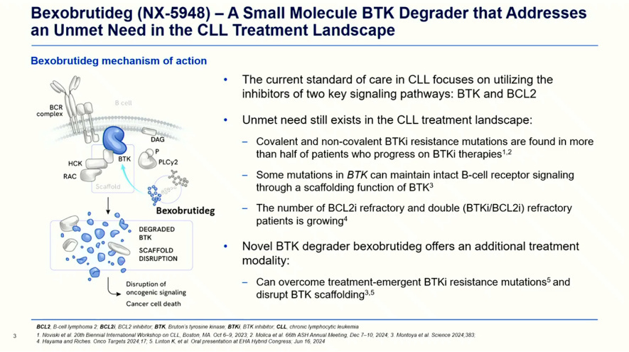 Bexobrutideg的出现,正是为了解决慢性淋巴细胞白血病治疗中日益增长的未满足需求。当前CLL的标准治疗方案主要依赖于BTK抑制剂和BCL2抑制剂(如维奈克拉)。然而,超过一半对BTK抑制剂治疗进展的患者中发现了共价和非共价BTK抑制剂耐药突变。此外,对BTK抑制剂和BCL2抑制剂均已进展的“双重难治”患者群体正在迅速扩大,包括那些已接受非共价BTK抑制剂Pirtobrutinib治疗的患者,这些患者群体迫切需要新的治疗选择。Bexobrutideg作为一种BTK降解剂,提供了额外的治疗模式,能够有效克服治疗过程中出现的BTK耐药突变,并重新破坏BTK的支架功能,为这些难治性患者带来新的治疗契机。