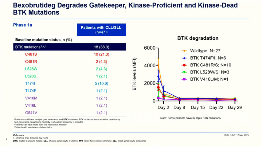 Alexey Danilov教授展示的药效学数据显示,Bexobrutideg给药后可导致BTK的快速降解。在研究的第8天,目标蛋白几乎被完全清除,且这种降解作用基本不依赖于BTK的突变状态。尽管大多数突变位于C481位点,但这些突变型BTK分子以及L528、T474、V416等其他突变型和野生型BTK均被迅速降解。这种不依赖突变状态的彻底降解,突显了BTK降解剂在克服耐药方面的潜力。