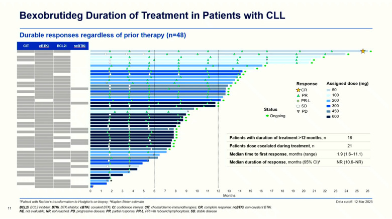 本次报告主要聚焦于Bexobrutideg Ia期剂量爬坡研究中CLL患者的数据。这项研究采用口服给药,每日一次,且同时也在非霍奇金淋巴瘤(NHL)和华氏巨球蛋白血症患者中进行相同剂量的探索。此外,研究还包括一项已完成患者招募的Ib期CLL剂量扩展研究,评估Bexobrutideg每日200 mg或600 mg在CLL患者中的安全性和有效性。