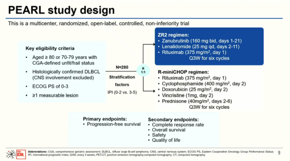 鉴于IR2和ZR2单臂试验的积极结果,PEARL研究作为一项多中心、随机、开放标签、对照非劣效性研究应运而生。该研究将老年、经综合老年评估(CGI)定义为unfit或虚弱状态的DLBCL患者按1:1的比例随机分为ZR2组和R-mini-CHOP组。主要终点是PFS,次要终点包括CR率、OS、安全性及生活质量。