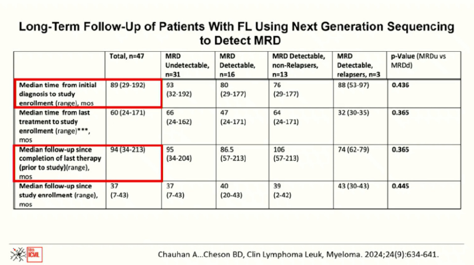 长期以来,滤泡性淋巴瘤常被描述为“高度可治但不可治愈”。然而,Cheson教授凭借数十年的临床经验和对长期无复发患者的观察,坚信滤泡性淋巴瘤是可治愈的。他的同事MD安德森癌症中心研究员Amishi Y. Shah通过一项研究支持了这一观点:对完成治疗后两年内未复发且有足够材料进行二代测序(NGS)检测MRD的滤泡性淋巴瘤患者进行分析。结果显示,大多数患者在10-6水平上MRD阴性,而5名MRD阳性患者中有3名发生复发,有力支持了滤泡性淋巴瘤可治愈的理论。