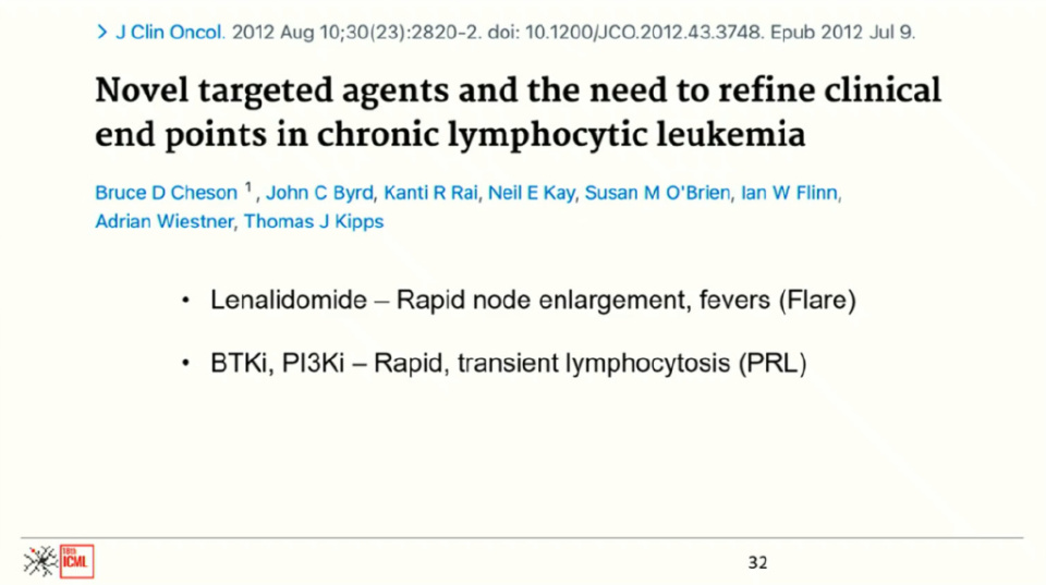 然而,随着靶向药物的出现,评估标准也面临新的挑战。例如,来那度胺可能引起快速进展性淋巴结病和发热的“炎症反应”(flare reaction),最初常被误诊为疾病进展。BTK和PI3K抑制剂则可能导致一过性淋巴细胞增多,为此引入了“伴淋巴细胞增多的部分缓解”(partial remission with lymphocytosis)这一新的缓解类别。