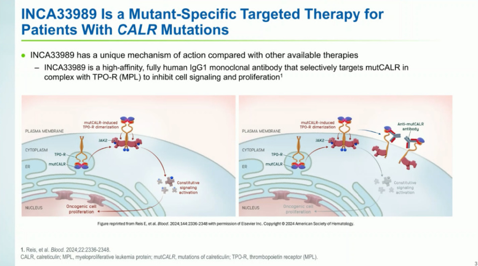 针对这一临床空白,INCA33989应运而生。Mascarenhas教授介绍,INCA33989是一款高亲和力的、全人源化IgG1单克隆抗体,其作用机制在全球范围内尚属首创。它能够选择性地识别并结合于突变型CALR与血小板生成素(TPO)受体形成的复合物上,通过抑制该受体的二聚化,进而阻断下游JAK-STAT信号通路的异常激活。在临床前模型中,这种精准的靶向抑制作用能够选择性地诱导携带突变CALR的细胞发生凋亡,从而从根源上清除恶性克隆。